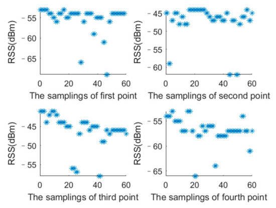 For the second characteristic, an experiment is carried out to verify its correctness. Figure 7 shows the measured RSS of one AP at four RPs. It can be seen that when T is greater than 45, the extreme values obtained remain constant. These results show the correctness of the characteristic and indicate that the T should be greater than 45. This characteristic means that the accurate RSS extreme values of RPs can be obtained through sampling. In subsequent experiments, the value of T is set as 60.