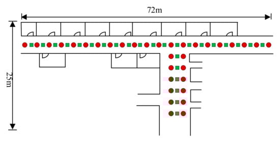 Figure 2 illustrates the framework of our algorithms, which can be divided into two stages, AP selection and positioning. In the first stage, DIOD keeps APs with high importance for positioning. It is an offline AP selection algorithm. In the positioning stage, the positioning algorithm is divided into three modules, SRP selection, UAP selection and weighted average modules. The SRP selection module contains area division and SCs selection. Area division is to construct circles based on the radius ρ. SCs selection compares the RSS value of the TP and the RSS extreme values in circles that contain the unknown RSS calculated offline by the GPR algorithm and the RSS collected at RPs and then selects SRPs whose RSSs are similar to the TP. For the UAP selection module, the unchanged APs in each SC are taken as an independent set, and, taking the intersection of all sets, the set of APs in the intersection are the UAPs. The weighted average module considers the Wi-Fi propagation characteristics and uses the RSS difference of UAPs received at SRPs and the TP to quantitatively calculate the similarity between SRPs and the TP and then obtain the estimation of the TP by weighting the coordinates of SRPs. Figure 3 shows the layout of the RPs, the TP and the APs.