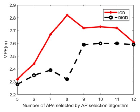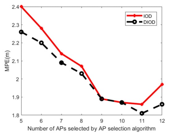 To verify the effectiveness of the proposed DIOD algorithm, IOD [30] and DIOD algorithms are used to select APs for positioning, respectively, and then to observe the positioning accuracy by using our proposed positioning algorithm. Figure 13 and Figure 14 show the MPE against the number of APs selected in Area 1 and Area 2, respectively. It can be seen that when a small number of APs are chosen, the MPE of DIOD performs better than IOD. This is because DIOD considers the RSS distribution. Furthermore, it can be seen that the experimental results in Area 1 are more smooth than those in Area 2. The reason is that the corridor of Area 2 is narrow, causing more multipath effects, so the reliability of the RSS distribution obtained in Area 2 is slightly worse than that in Area 1. Furthermore, DIOD can improve the positioning accuracy by 5.83% and 17.73% at the highest in Area 1 and Area 2 respectively, compared with IOD algorithm.
