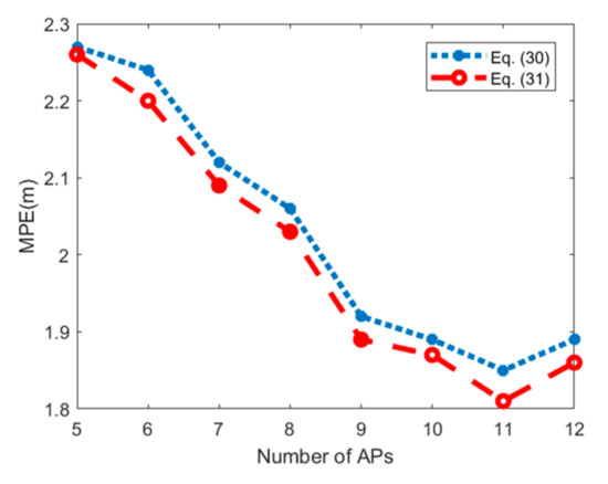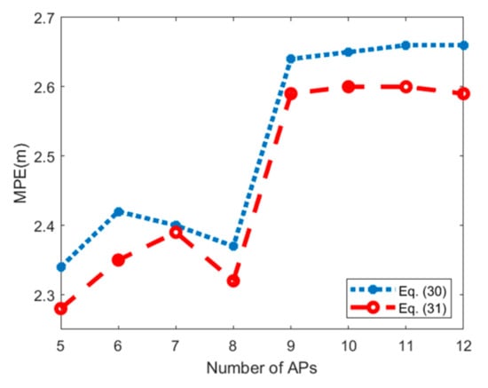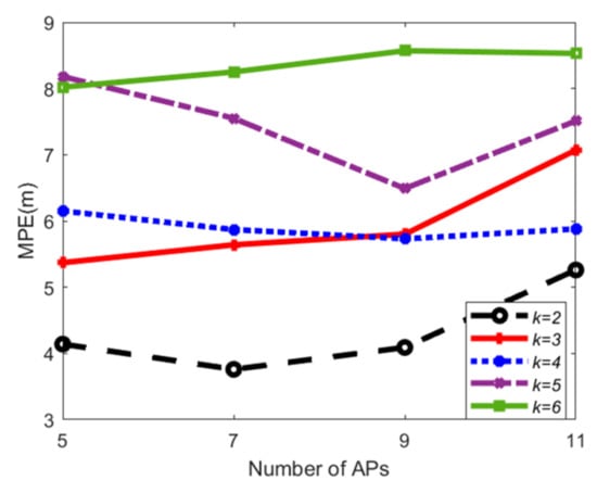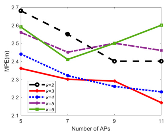 Based on the results in Ref. [30], when the number of APs selected for positioning is 5 to 8, calculating positioning accuracy by using the IOD algorithm is better than using other algorithms such as information theory-based and machine learning-based algorithms [33,35]. When the number of APs selected continues to increase, the positioning results of IOD are almost the same as other algorithms. Therefore, the IOD algorithm [30] can provide high positioning accuracy with a small number of APs while improving the online running time.