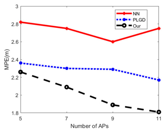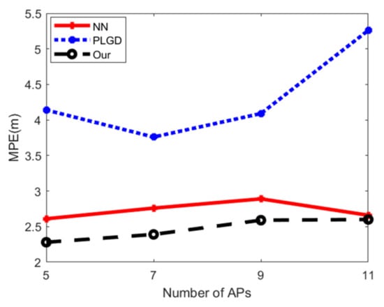Firstly, we compare the positioning results between different algorithms in the case of a small number of APs. Note that ELM requires a large number of features, and the effect of ELM is not strong in the case of a small number of APs; therefore, for this experiment, the positioning accuracy of ELM is omitted since its performance is nowhere near comparable to other algorithms. Figure 19 and Figure 20 show the MPE in two areas, respectively. It can be seen that in the different areas, the performance results between NN and PLGD are unstable. PLGD performs better than the NN algorithm in Area 1 but the opposite in Area 2. However, the proposed positioning algorithm can maintain the best positioning accuracy in both experimental areas. The reason is that the proposed algorithm considers the relationship between RSS and the location of RP.