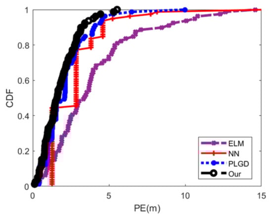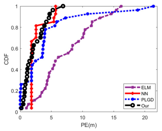 Secondly, we compare the optimal positioning CDF between different algorithms. For ELM, all detected APs are selected as features to train the positioning model. Figure 21 and Figure 22 show the results in the two areas, respectively. It can be seen that the proposed algorithm obtains the best accuracy, with 1.81 m and 2.28 m in the two areas, respectively. From these experimental results, it can be seen that the proposed positioning algorithm can provide higher positioning accuracy. Furthermore, in Area 1, our proposed positioning algorithms can improve the accuracy by 16.59%, 34.18% and 54.86%, compared with PLGD, NN and ELM. Similarity, in Area 2, our proposed positioning algorithms can improve the accuracy by 44.93%, 12.64% and 69.19%.