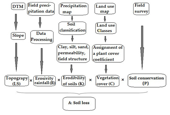 Soil erosion is an alarming and very serious problem, especially in the study area, where different factors contribute to the rapid erosion of soil. Factors, such as steep slope of the region, very erodible soils, alarming degradation of the plant cover, and climate cause the issue of soil erosion. The study area is fed by precipitation most often in the form of violent and short thunderstorms [46]. For the estimation of soil loss in the study area, the revised universal soil loss equation (RUSLE) model was used in combination with geographic information system (GIS).