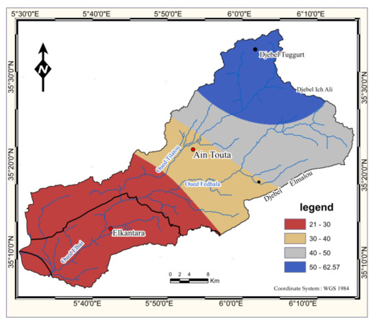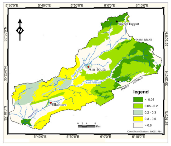 Class 1. The soil loss rate is less than 10 t·ha−1·yr−1 and covers 45.2% of the total area of the watershed. It occupies the plains of Ain Touta and El Kantara because of the low slope and is also located under the dense and moderately dense forests of Jebel Tuggurt and Jebel Garouaou.