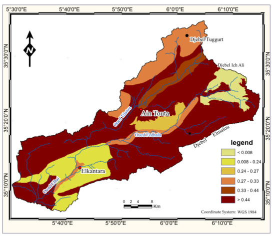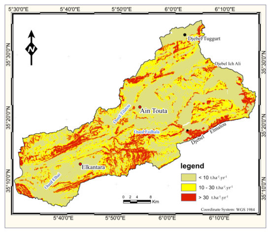 Average loss by water erosion in aquifers for all the homogeneous units is about 16.69 t·ha−1·yr−1. The erosion rates differ from one area to another of the watershed, depending on the influence of different factors that control the erosion process. However, the minimum potential erosion rate values are mainly located on the plain of Ain Touta and lower than El Kantara because of the low slope. For some forests, such as Jebel Tuggurt and Jebel Garoua, despite the value of the K factor and the low value of the plant cover factor, their potential erosion rate remains high. The extreme high erosion rate values are mainly located in the mountainous areas with quite steep slopes. They are not agricultural lands, mostly bare soils with very low vegetation cover (Figure 8). There is some information on the results of USLE/RUSLE application in some regions in Algeria but they are general, and cannot be compared due to the great difference in the physical, climate and soil characteristics. Algeria is a wide country from east to west and from north to south. Concerning our study area, no previous studies have been made yet that uses this application in particular or the erosion in general. The current study is the first one on this region, which uses the RUSLE approach. Therefore, we could not compare our results.