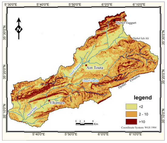 The different geological units extend from Quaternary to Triassic, of which the main formations belong to the Cretaceous [36]. The geological formations are very variable: basically, sedimentary rocks, such as more or less hard limestones, sometimes dolomitic, and marly rocks strongly altered on the surface mainly due to the very harsh climate of the region. The fields occupied by alternating between gray and green marl and clear massive limestone, outcrop at Djebels Tuggurt, Ich Ali and Metlili. The massive limestones occupy the half-block of El Kantara with a thickness of 340 m, Djebels Bouss and El Malou. Hard sandstones and soft marls containing gypsum crystals, outcrop in the extreme north of the basin (Jebel Tichao). Therefore, Oued El-Hai watershed is characterized by components that promote onset of all forms of erosion. Altitudes decrease from upstream to downstream with a vertical drop of 1714 m. The slopes are medium to steep, where the class of slope ranging from 0% to 3 % and 4% to 12% presents 42.96%, whereas the class of slope ranging from 12.5% to 20% presents 48.84% of the total area. Rock formations are of medium to low resistance to erosion. Additionally, soils are skeletal, little evolved with raw minerals and poorly protected by degraded to very degraded vegetation, particularly scrubland. All these factors prove that the study area suffers from the phenomenon of erosion.