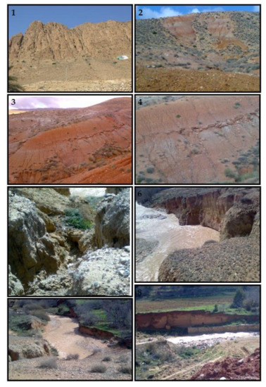Some forms of water erosion in Oued el-Hai watershed. (1–4) Bad lands; (5) ravine on clayey soil (regressive erosion) in Ain Touta; (6–8) Underminingof the banks of Oued Tilatou and Oued Ain Touta, respectively. (Photos taken by authors).