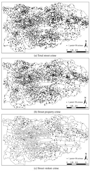 Several limitations of this research should be noted and addressed in the future. First, although the street view image is a valuable and accessible data source for determining the on-street population size, most street view images were captured in the daytime. Therefore, it cannot be known what the population size on the street was in the evening. Future studies could use satellite night light data to proxy on-street populations in the evening, as facilities are typically associated with lights at night [78]. Second, some objects such as litter, graffiti, broken windows, and property damage are not easily detected using existing methods. These objects are signs of physical incivilities, which have been demonstrated to attract crimes. Future studies could collect such fine-scale quantitative data using the environmental audit approach [5]. Third, apart from the physical environment, human visual perception of the urban environment can also affect the occurrence of crimes. Therefore, future research could account for perception [50].
