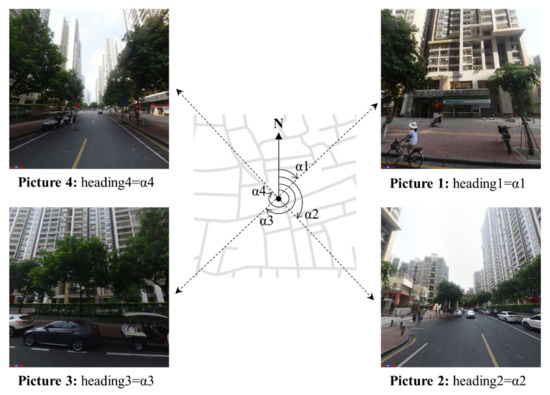 An example of calculating heading angles of four BSV images at a sample site. Heading angles of Pictures 2 and 4 are parallel to the street, capturing the front and rear views, while heading angles of Pictures 1 and 3 are vertical to the street, capturing the left-hand and right-hand views.