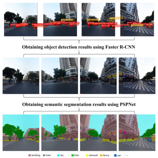Some objects like persons and cars are discrete elements with relatively fixed shapes and distinct outlines in an image. Therefore, it is practical to measure the count of identifiable objects. Faces and license plates are blurred in the Baidu Street View images; therefore, this study had no privacy or ethical issues. This study applied a pretrained Faster R-CNN network [55] to perform object detection for BSV images. This network was chosen because it reached a good balance between prediction accuracy and operational efficiency as a state-of-the-art deep learning network. Additionally, it was perfectly compatible with the high resolution of BSV images collected in this study (1024 × 1024 pixels).