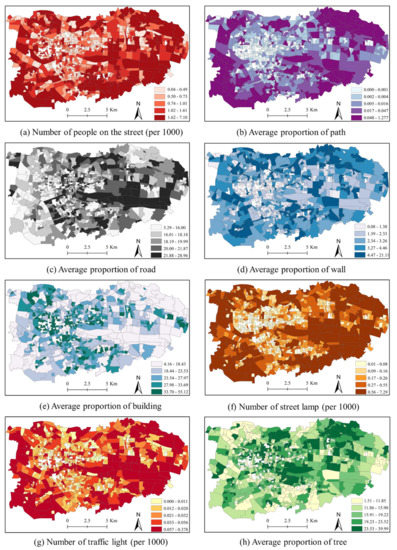 By combining the results of object detection and the semantic segmentation networks (see Figure 3), we finally derived eight quantitative measurements of streetscape features. They were the number of people on the street (per 1000), the average proportion of paths (%), the average proportion of roads (%), the average proportion of walls (%), the average proportion of buildings (%), the number of streetlamps (per 1000), the number of traffic lights (per 1000), and the average proportion of trees (%). The rest of the object categories were not included in the analysis as they were considered irrelevant to crime in an urban context. Figure 4 presents the spatial distributions of people on the street and the streetscape physical features retrieved by BSV images and deep learning methods.
