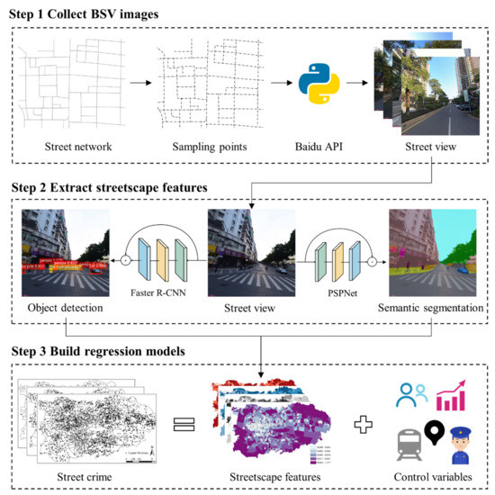 Figure 5 summarizes the workflow of the study, which included three steps: (1) generating sampling points along the street, based on which fine-grained BSV images were collected using the Baidu API, (2) extracting streetscape features using an object detection method (Faster R-CNN) and a semantic segmentation method (PSPNet), and (3) building regression models to determine the influences of the on-street population and streetscape physical environment on street crime, controlling for the effects of socioeconomic and demographic factors, land use features, and surveillance and transportation facilities.