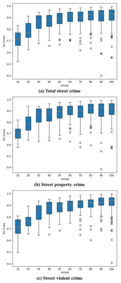 We used the k-fold cross-validation technique to validate the regression models used in this study. This technique first divides the total dataset into k parts of equal size, iteratively excludes one part (called the validation set) at a time, and predicts it with the parts not excluded (called the training set). At each step, an R2 score can be calculated, measuring the prediction accuracy of the trained model. Figure 6 presents the results of the cross-validation R2 score when k was set at different values. When k reached about 30 and above, the performance of the three models became stable, with the R2 score reaching above 0.8, indicating that the models in this study were sufficiently accurate.