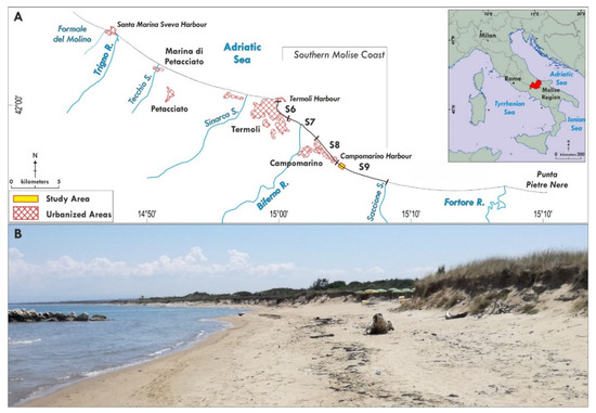 In agreement with previous studies ([35] and references therein), the subdivision of the southern Molise coast in coastal segments S6–S9 (Figure 1A) has been maintained in the present study to better compare shoreline change rates calculated up to date.