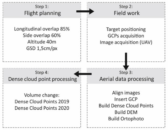 To obtain the final outputs (Dense Cloud Points, DEM, Orthophoto and Volume change), we followed the work-steps illustrated in Figure 2: (1) Generation of the flight plan; (2) Fieldwork consisting in the positioning of the targets in the field, measurement of the position with the GNSS receiver and acquisition of photos with the UAV; (3) Aerial data processing (as described by [45]), error checking of the model against GCPs (Table 4—The errors represent the average displacement of the point cloud, orthophoto and DSM with respect to the position of the points measured with the GNSS), and export of point clouds, DEMs and orthophotos; (4) Dense cloud point processing. To obtain information about volume changes, the point clouds of 2019 and 2020 were imported into the Cloud Compare software. The volume changes were calculated with the 2.5D Volume tool.