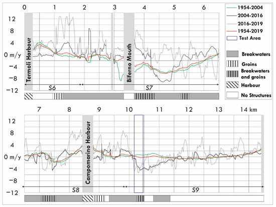 Long to short-term annual shoreline changes along the southern Molise coast (segments S6–S9) during periods 1954–2019, 1954–2004, 2004–2016 and 2016–2019.
