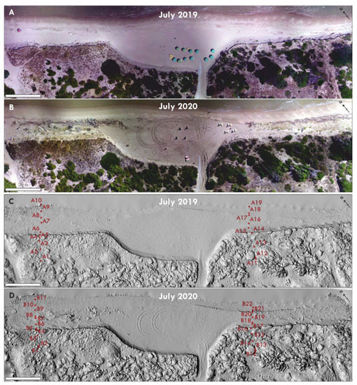 Based on the data acquired during UAV flights 2019 and 2020, orthophotos (Figure 4A,B) and related DEMs (Figure 4C,D) were produced. Comparing the two orthophotos of the test area (Figure 4C,D) gives evidence about a net increase from 2019 to 2020 of the coverage in vegetation debris and other kind of beach litter in the northern and southern portions of the study beach. In the central portion, instead, the beach appears clean, and several vehicle tracks are clearly visible (Figure 4B) suggesting operations of cleaning and smoothing of the beach.