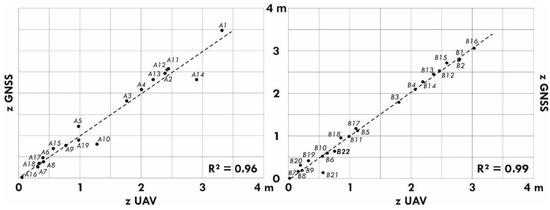 Comparison between altimetric data acquired with GNSS surveys in 2019 and 2020 (GNSS sampling points A1–A19 and B1–B22) and those derived from UAV surveys performed at the same time.