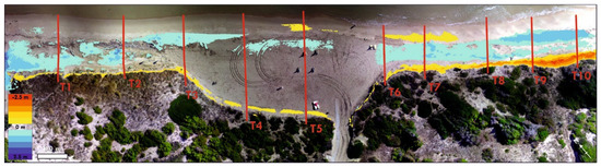 The result of the difference between the Dense Clouds Points 2019 and 2020, plotted on the orthophoto derived from UAV flight 2020. The scale of colours on the left indicates the degree of aggradation and lowering of the topographic surface, subdivided in 0.5 m intervals. The location of ten beach profiles (T1–T10) extracted from DEMs 2019 and 2020 is shown.