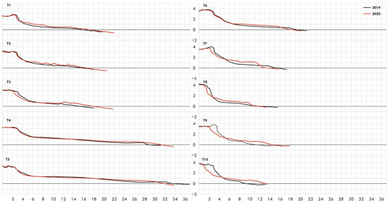 First, it is possible to note that the test area is substantially stable; positive and negative shoreline changes 2019–2020 are limited within a few meters (Figure 7) and reach maximum values of 4–5 m along the southernmost profiles T9 and T10 (Figure 7).