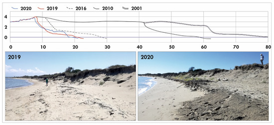 An example of significant and progressive erosion that characterizes the study area and the entire southern portion of the Molise coast is provided by the beach profiles surveyed from 2001 onwards (Figure 8) in correspondence of T7.