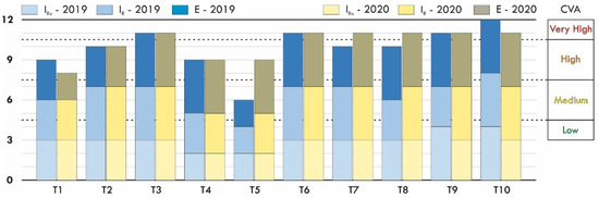 Comparison of IRU, IR and, E indexes and related CVA levels obtained for 2019 and 2020 along profiles T1–T10.