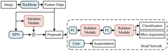 Our improved Mask R-CNN is illustrated in Figure 2. It includes three parts: ResNet-50 and a Feature Pyramid Network (FPN) as the backbone; a Region Proposal Network (RPN) with spatial attention; and a head network with relation modules. First, as the original Mask R-CNN, ResNet-50 [44] and a FPN [45] are used as the backbone for the extraction of multiscale feature maps. Then, an RPN is utilized to predict the objectness scores and object bounds at each position. Meanwhile, an attention module is used to obtain a spatial attention map. The objectness scores and the spatial attention map are merged using elementwise multiplication. The proposals with higher scores are fed into the head network. In the head network, there exist two branches: a Fully Connected (FC) head for proposal recognition (classification and bounding box regression) and a mask head for segmentation using a small FCN. Relation modules are embedded after each fully connected layer of the FC head. The object location relations can be learned using this structure.