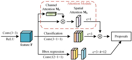 Our spatial attention RPN is shown in Figure 3. An attention module is added as a new branch. Given an input feature map , our method sequentially generates a 1D channel attention map and a 2D spatial attention map . Then, the 2D spatial attention map and the objectness scores of the classification network are merged through an elementwise multiplication. The overall attention process can be summarized as follows: