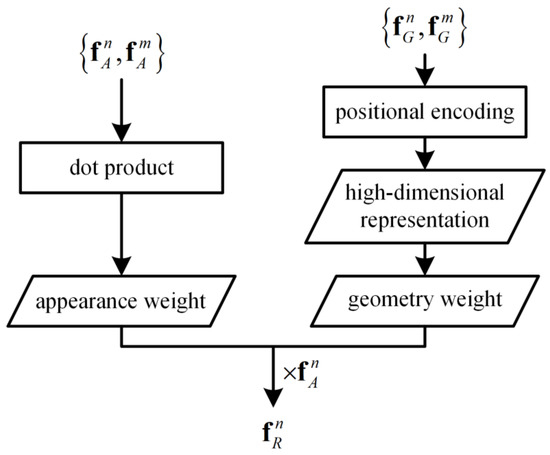 The object relation module was proposed by Hu et al. [43] in 2018. Their approach was inspired by a basic attention module, called Scaled Dot-Product Attention [46]. For one object, there exists an appearance feature and a geometric feature . The appearance feature indicates the clipped feature map in its bounding box. The geometric feature indicates the four-dimensional object bounding box. Figure 4 shows the computation of the relation feature. For the nth object, its appearance feature and the appearance features of other objects are projected into subspaces through a dot product. An appearance weight, indicating their similarities, is then computed. The geometric features and are also embedded into a high-dimensional representation using sine and cosine functions of different wavelengths [46]. Finally, the appearance weight, geometry weight, and are combined together to obtain a relation feature .