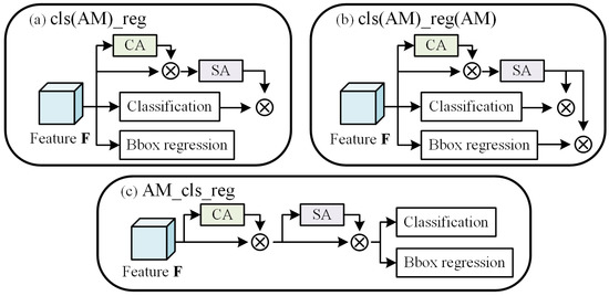 In this section, we compare the results of three combinations using attention modules and the RPN. The network architectures of different combinations are shown in Figure 5. In Figure 5, AM indicates the attention module, cls represents the classification subnetwork, reg indicates the bounding box regression sub-etwork, CA is the channel attention, SA is the spatial attention, and ⊗ indicates the elementwise multiplication. In the first variant (Figure 5a), the input feature is fed into three branches: an attention module, classification, and bounding box regression. In the subnetwork of the attention module, a channel attention map is first computed and merged with the input feature to obtain a new feature map. A spatial attention map is then generated for multiplication with the objectness scores of the classification branch. This architecture is labelled cls(AM)_reg. In the architecture shown in Figure 5b, labelled as cls(AM)_reg(AM), the spatial attention map is further merged with the output maps of the bounding box regression. In Figure 5c, the attention module is executed on the input feature. The output feature is then used for classification and bounding box regression. This architecture is labelled as AM_cls_reg.