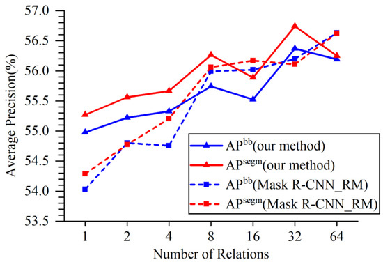 The AP values are depicted as a line chart in Figure 6. The horizontal axis represents the number of relations. The vertical axis represents the AP values of the different methods. The solid lines in red and blue represent the APs of our method for object detection and segmentation, respectively. The dash lines in red and blue indicate the and of the Mask R-CNN with relation modules, respectively. As shown in Figure 6, when the number of relations is small (less than 8), by increasing the number of relations, the and of these two algorithms increase, although the advantages of our method gradually decrease. When the number of relations equals 16 for our method and 32 for the Mask R-CNN with relation modules, the APs decreases slightly. When the number of relations equals 32, our method can achieve the highest AP results. As the number of relationships continues to increase, the AP values of our method begin to decrease. When the number of relations equals 64, the Mask R-CNN with relation modules obtains the highest AP results. Considering the tradeoff between the AP and computational complexity, is used in our approach. The results of the experiments demonstrate the advantage of the spatial attention RPN. Thus, our method can achieve higher AP results with a smaller number of relations.