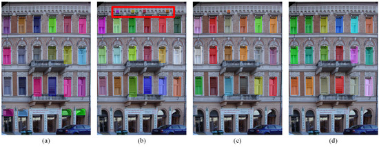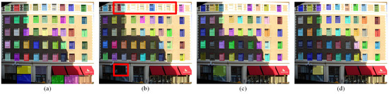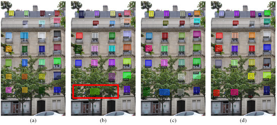 This section shows a qualitative comparison of the proposed method and Mask R-CNN. We chose three facade images, as shown in Figure 7, Figure 8 and Figure 9. Subgraph (a) shows the ground truth of window instances. Subgraph (b) shows the results of the Mask R-CNN. Subgraph (c) shows the results of the Mask R-CNN with a spatial attention RPN. Sub-graph (d) shows the results of the Mask R-CNN with a spatial attention RPN and relation modules. Different window instances are rendered in different colors. The segmentation errors are marked by the red rectangles.