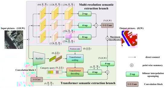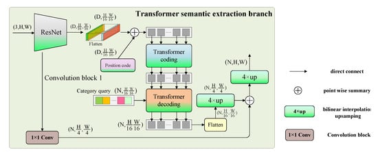 The overall framework of the Transformer semantic extraction branch is composed of a hybrid convolutional neural network (backbone network) and Transformer encoding and decoding modules. The structure of this branch is shown in Figure 6, D in the figure is the mapping dimension, and N is the number of categories. Firstly, the backbone network adopts ResNet-18 with a sliding window to extract features. Secondly, the backbone network performs 16 times down-sampling, flattening the feature map in the width and height dimensions to obtain a feature map with a dimension of (D, H/16, W/16). Next, we add the obtained feature map to the position coding matrix of the same size and input the result into the Transformer coding module for global coding. The number of times the encoding module repeats the encoding is set to 6. Corresponding Transformer decoding is performed after encoding, and a total of 6 decoding layers are set. The query matrix of the first decoding layer is provided by the category matrix and the query matrix after the second layer is the output of the previous decoding layer. In addition, the key-value matrix and the numerical matrix are also the output of the decoding matrix of the previous layer. After Transformer encoding and decoding, the feature map with a dimension of (H, H/16, W/16) is outputted. Then, the last dimension of the feature map is flattened into two dimensions to obtain a feature map (H, H/16, W/16) with the number of channels of category N. Next, the new feature map is up-sampled 4 times to obtain the feature map with a dimension of (H, H/4, W/4). The reason for using 4 times up-sampling is to make the size of the feature map consistent with the convolution block 1 of the backbone network. Since the feature map of the convolution block 1 is used to enrich position information, the fusion of the feature map can help position restoration. Finally, the feature map needs to be restored to the input image size to achieve pixel-level classification. In the restoration process, the feature map is up-sampled 4 times to obtain the feature map.