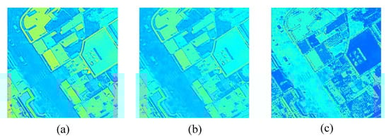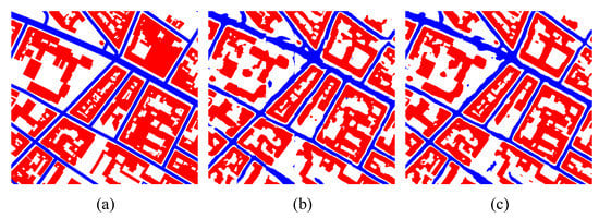 It is concluded from Table 6 that the two strategies of both multi-scale fusion and sliding splicing can improve the prediction accuracy to a certain extent, and the prediction accuracy reaches the highest when the two strategies of multi-scale fusion and sliding splicing are used at the same time. In order to visually demonstrate the effectiveness of the post-processing strategy, Figure 15 shows the comparison between the predicted result without using post-processing strategies and predicted the result using two post-processing strategies. From the comparison of Figure 15b,c, it can be seen that the post-processing strategies reduce the stitching traces of splicing pictures, and the outlines of the foreground target buildings and roads in the picture are clearer.