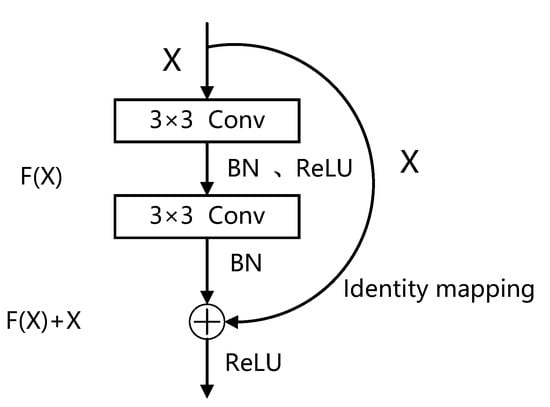 Many excellent CNNs have appeared in recent years, including ResNet [], VGG [] and GoogLeNet []. After considering the amount of parameters and network accuracy, this work adopts the ResNet-18 basic module as the residual block in the three branches. The structure of the two residual modules in Figure 3 is shown in Figure 4. This work uses residual modules with two kinds of strides, the forward propagation of the residual module with a stride of 1 is shown in Equation (1).