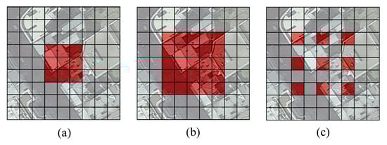 Comparison of different void rates and convolution kernel receptive fields. (a) Receptive field of convolution kernel; (b) receptive field of convolution kernel; (c) receptive field of convolution kernel with a dilation rate of 2.