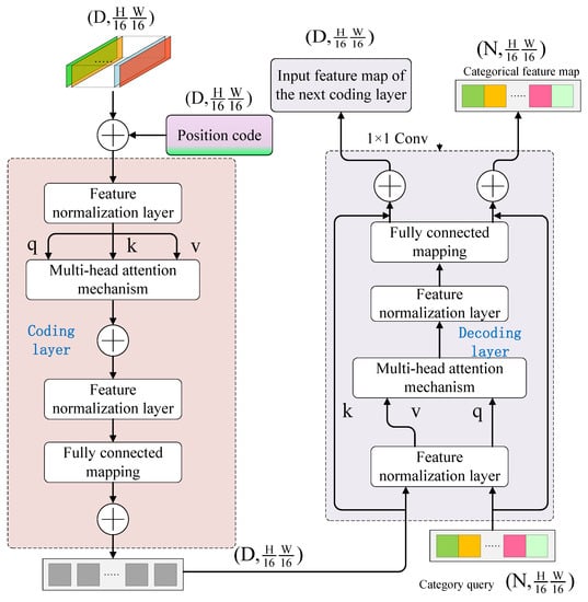 The input of the decoding layer is composed of two parts: the output feature map of the coding layer and category query feature map created based on the number of categories. The feature layer is normalized before entering the multi-head attention mechanism of the decoding layer, and then the output feature map of the coding layer is decomposed into a key-value matrix and a numerical matrix through different matrix mappings. Among them, N is the number of categories. The calculation process is shown in Equations (10)–(12).