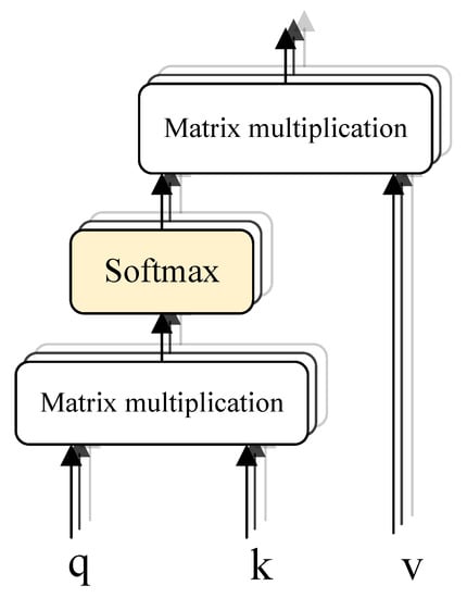 The structure of the multi-head attention mechanism module is shown in Figure 8. As shown in Figure 8, query matrix q, key-value matrix k, and numerical matrix v are inputed. The calculation process of a single attention mechanism is as follows: Firstly, the key-value matrix and the transpose of the query matrix are multiplied. Secondly, Softmax is performed at the last of the results obtained. Finally, the result of Softmax and numerical matrix are multiplied to obtain the attention result. In addition, the multi-head attention mechanism proposed in this paper splices the single-head attention mechanisms to obtain the attention mechanism information of different branches.
