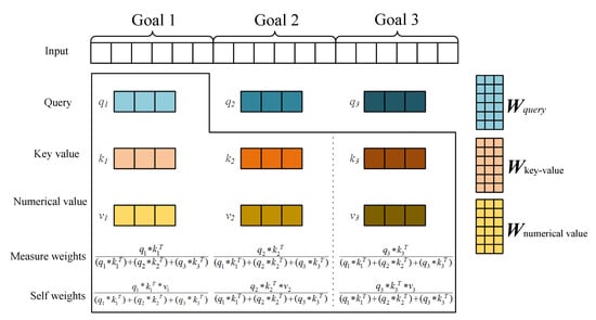 The decomposition process of a single self-attention mechanism module is shown in Figure 8. In the case of inputting three targets, the three targets are calculated by their corresponding query matrix mapping matrix , key-value mapping matrix , and numerical mapping matrix to obtain their respective query matrix, key-value matrix, and numerical matrix (). Next, Softmax calculates the weights of the target itself and all targets. The calculation process of measure weights is shown in Equation (14), and the decomposition structure of the calculation process of the self-attention mechanism is shown in Figure 9.