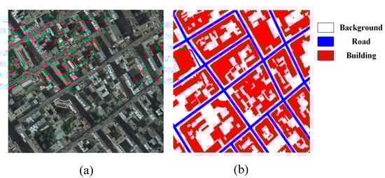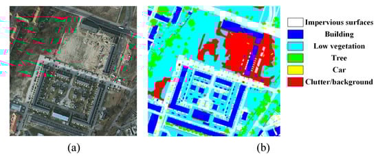 Original image and label example from Potsdam-B; (a) image; (b) label.