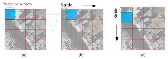 Schematic diagram of the sliding window splicing prediction strategy; (a) initial window postion; (b) stride for sliding right. (c) stride for sliding down.