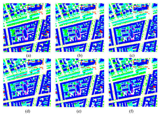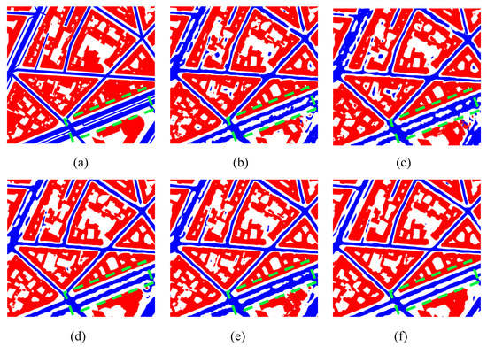 Comparison of the prediction results on Potsdam-B; (a) the superposition of the image and the label; (b) FCN-8S; (c) U-Net; (d) PSPNet; (e) DeeplabV3+; (f) HMRT.
