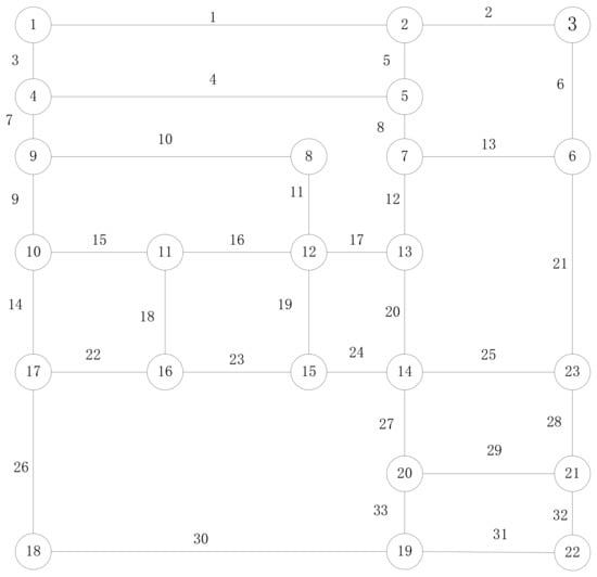 The area investigated in this study is shown in Figure 1. The road network model is for Erqi District, Zhengzhou. Multiple managers patrol the specified grid area. Each city manager has a fixed patrol route consisting of road segments. This road network is assumed to be patrolled by multiple managers on electric bicycles. The road network for the study area is shown on Figure 2. The figure shows a section of the road network near Xizhan Road in Erqi District. A road network model is established for roads in the patrol area on the map. The width of the road is shown in the figure according to the actual situation. Figure 3 is a mathematical abstract model of the road network model, which can be abstracted as an undirected graph. This network includes 23 nodes and 66 directed road segments.