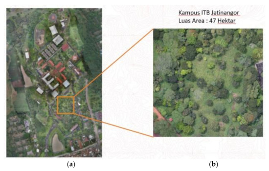 (a) The orthophoto of ITB Jatinangor Campus and (b) the modeling area of interest.