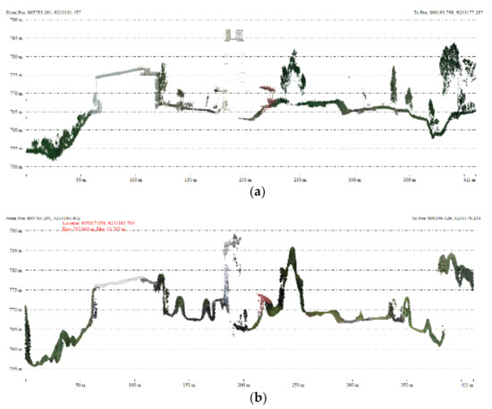 The cross-section of the point clouds resulting from (a) LiDAR data acquisition and (b) photogrammetry data acquisition.