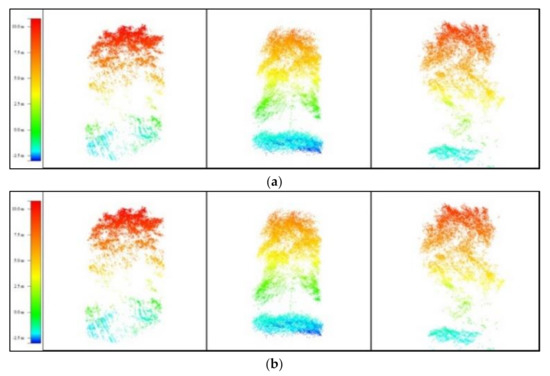 The results of the segmentation of the individual tree point clouds from (a) LiDAR data acquisition and (b) photogrammetry data acquisition.