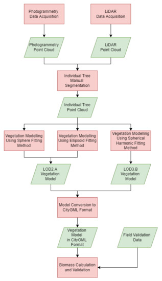 The paper is divided as follows: Section 1 explains the urgency of building a 3D model in managing green open space using LiDAR and photogrammetry point clouds data. Section 2 will discuss some related works in 3D modeling of the individual tree, the use of CityGML, and the method of determining the biomass. Section 3 will describe the proposed workflow and explain the methods used in the data processing section. Section 4 will present the results of research that has been carried out, such as the selection of the Diameter Breast Height (DBH), the creation of a canopy and trunk model using three surface fitting methods, the creation of a 3D model in CityGML format, and the calculation of biomass in the area of interest. Section 5 is a discussion and analysis of the results that have been presented in Section 4. Section 6 is the conclusion of the research that has been done.