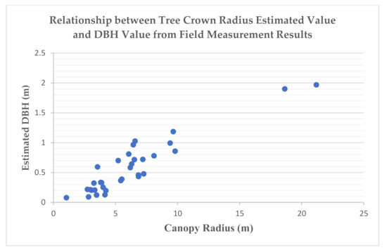 The Scatter Plot of Relationship between Canopy Radius Estimated Value and DBH Value from Field Measurement Results.