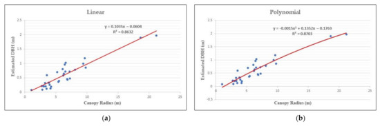 where D is the estimated DBH value, r is the value of the measured tree crown radius, and b is the coefficient of the equation.
