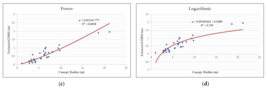 The regression result of DBH estimation using (a) linear method, (b) polynomial method, (c) power method, and (d) logarithmic method.